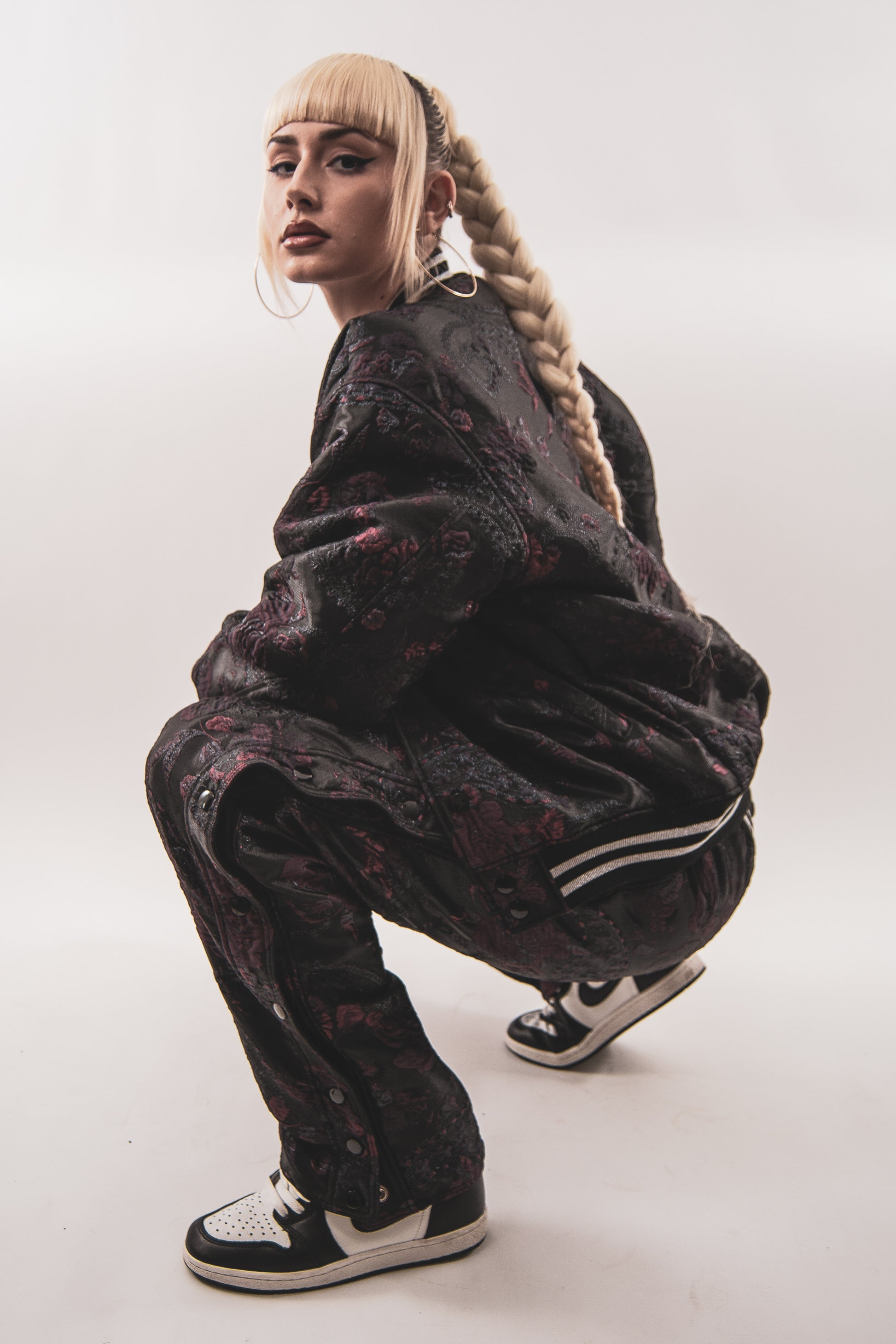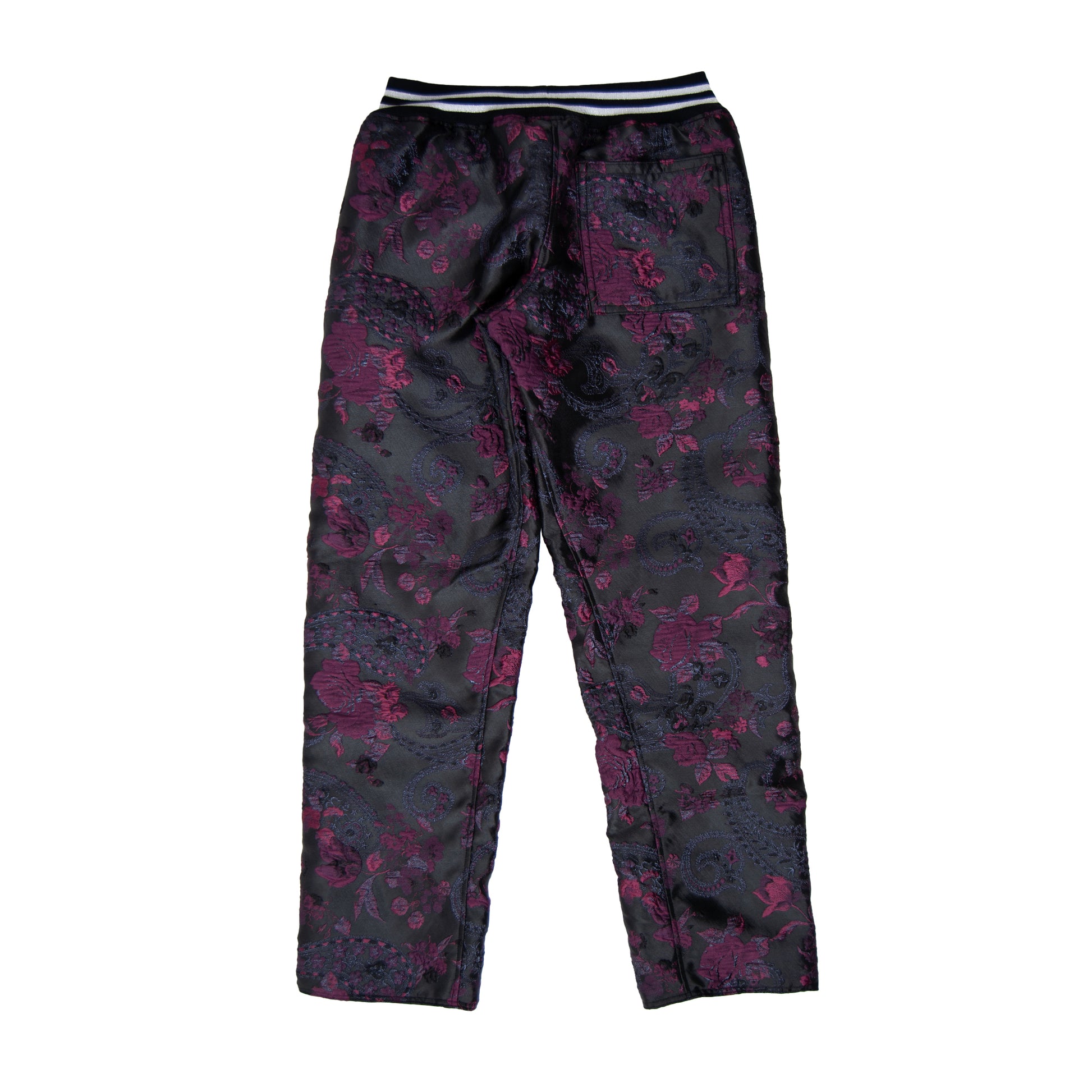 Metallic 3D brocade tearaway track pants lined with silk.