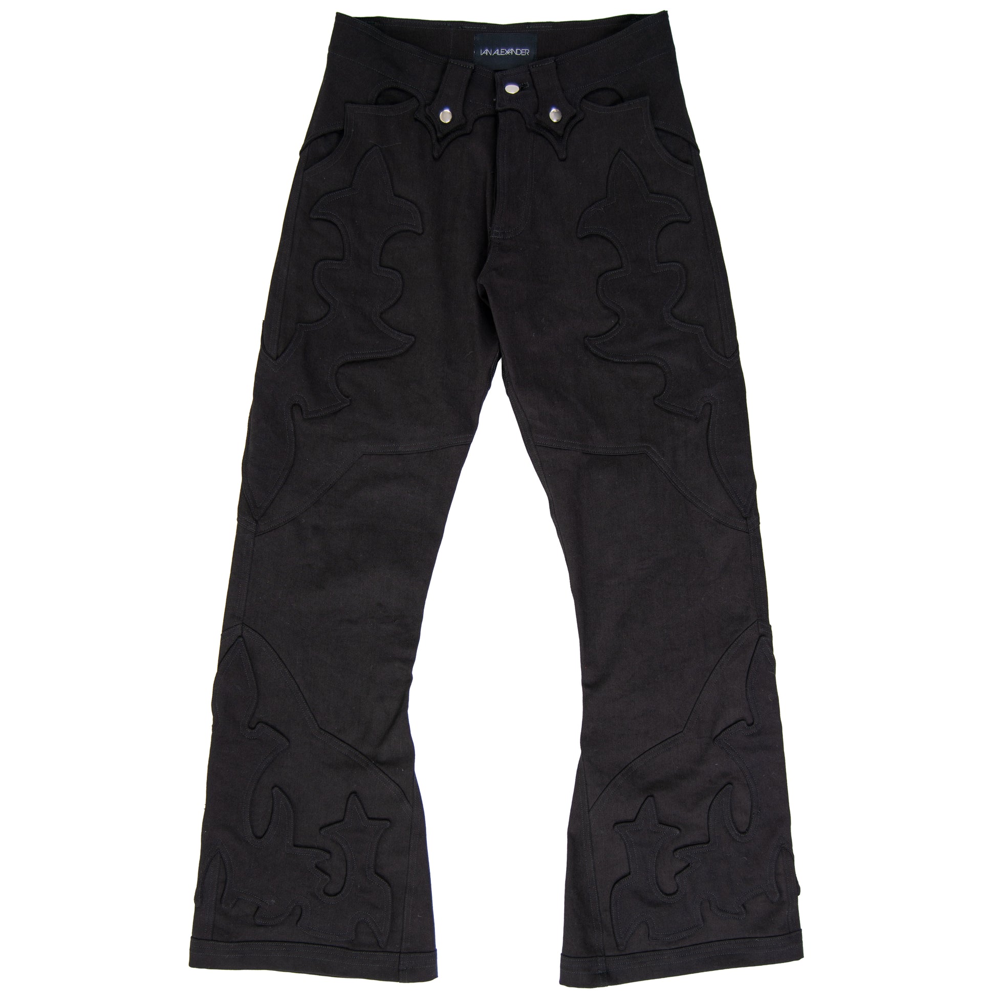FLARED DENIM JEANS WITH CUSTOM APPLIQUE AND WAISTBAND