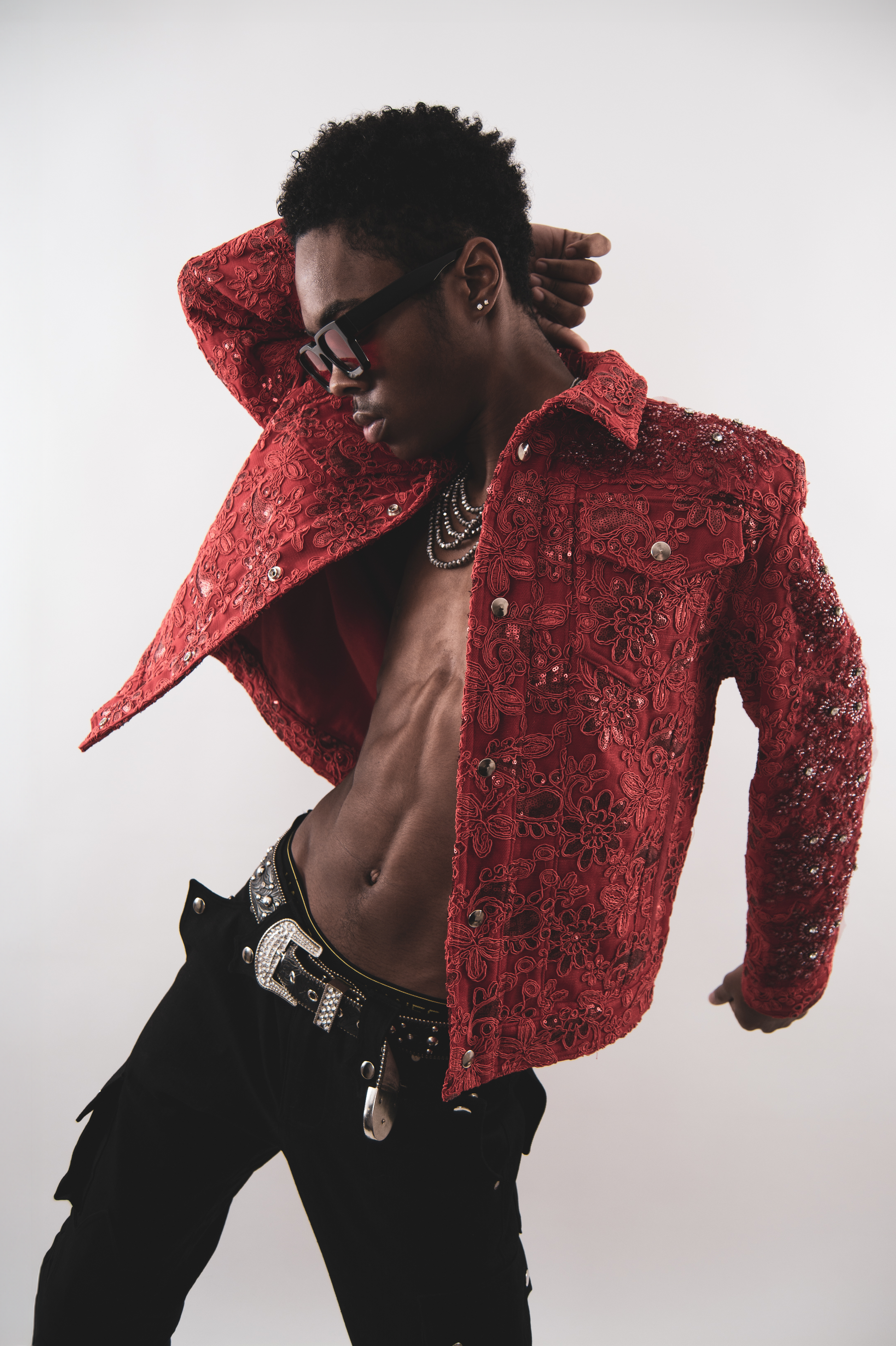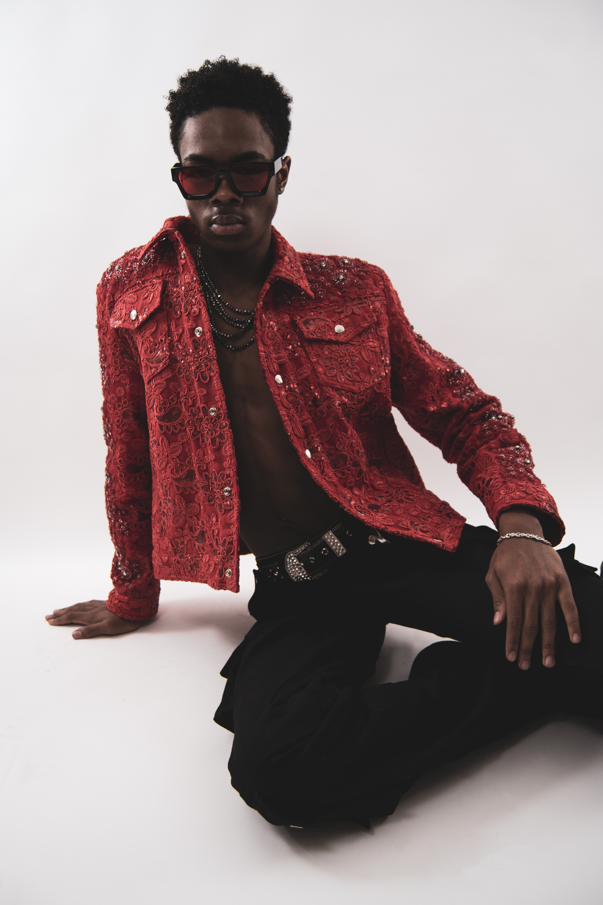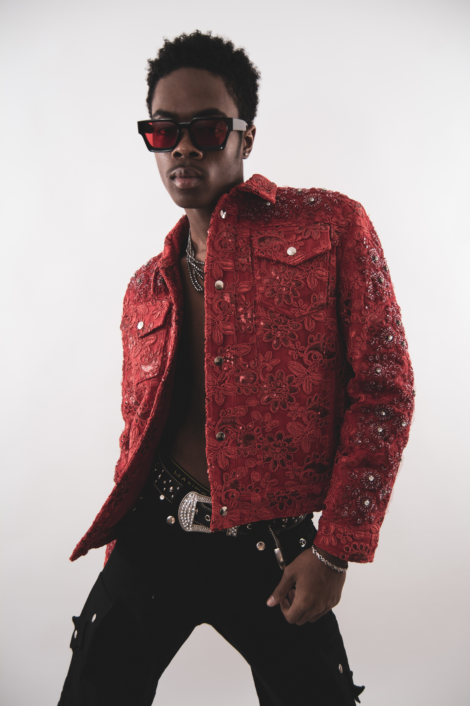 Cherry red denim with sequin lace and 3D crystal embellishment. Self lined.