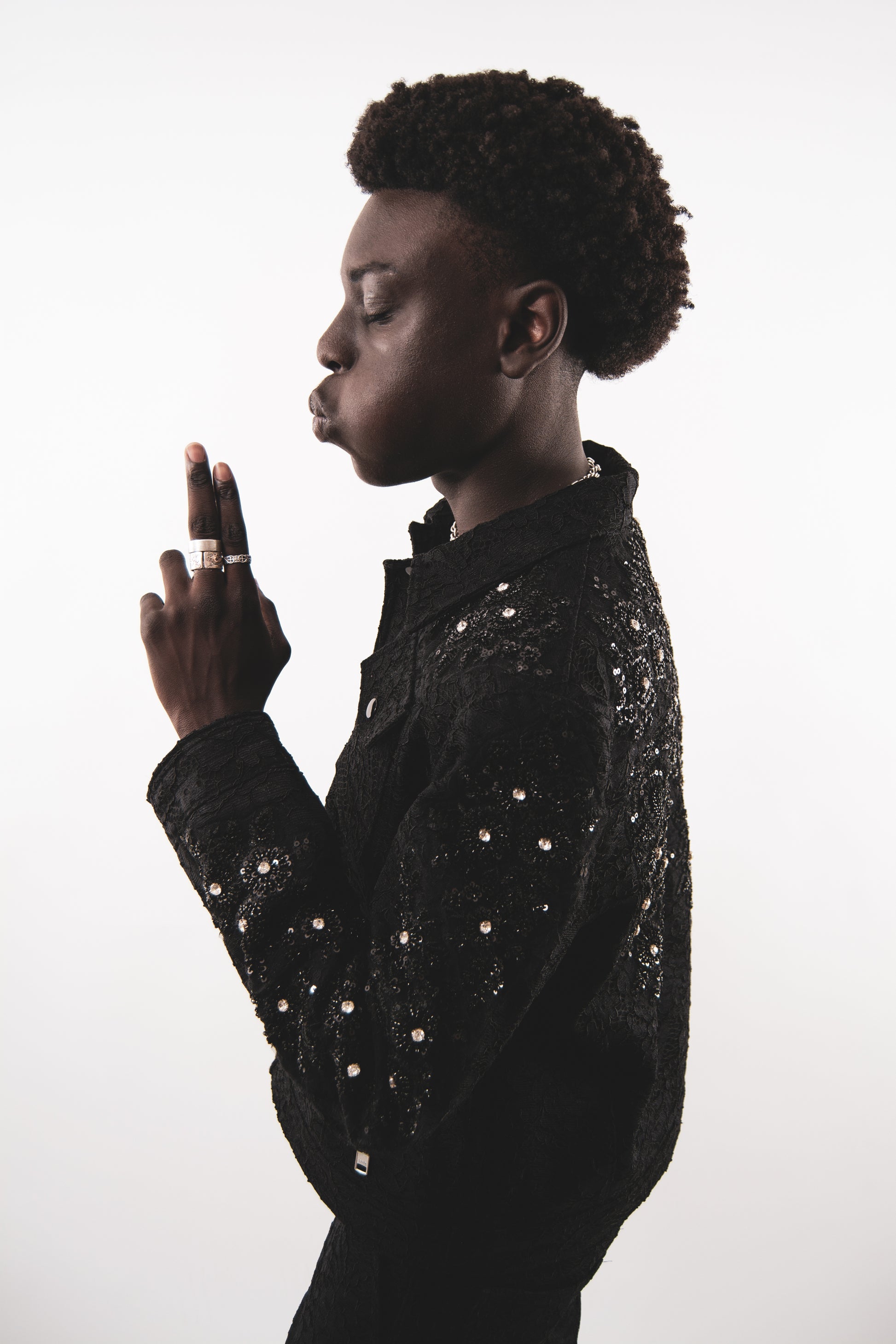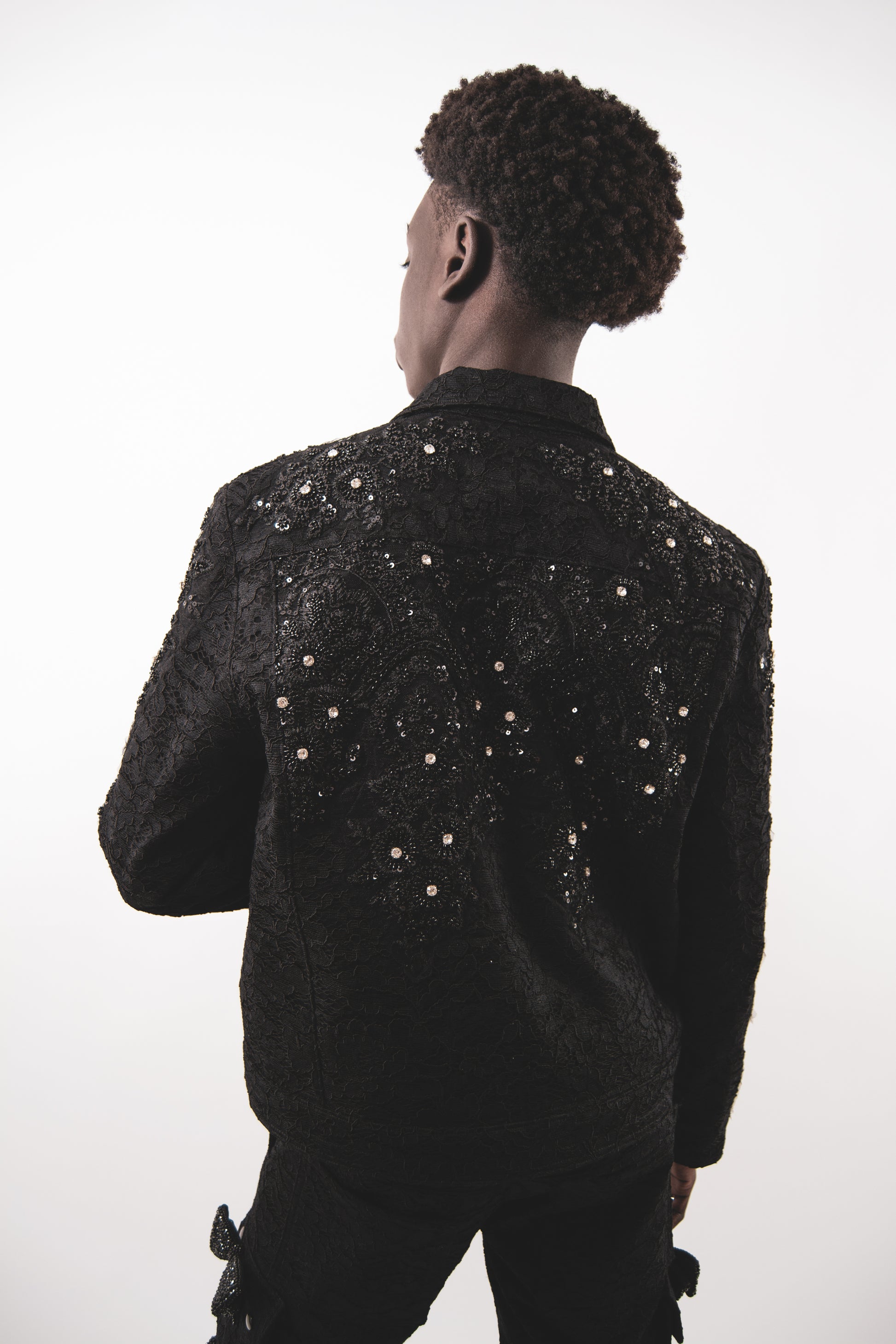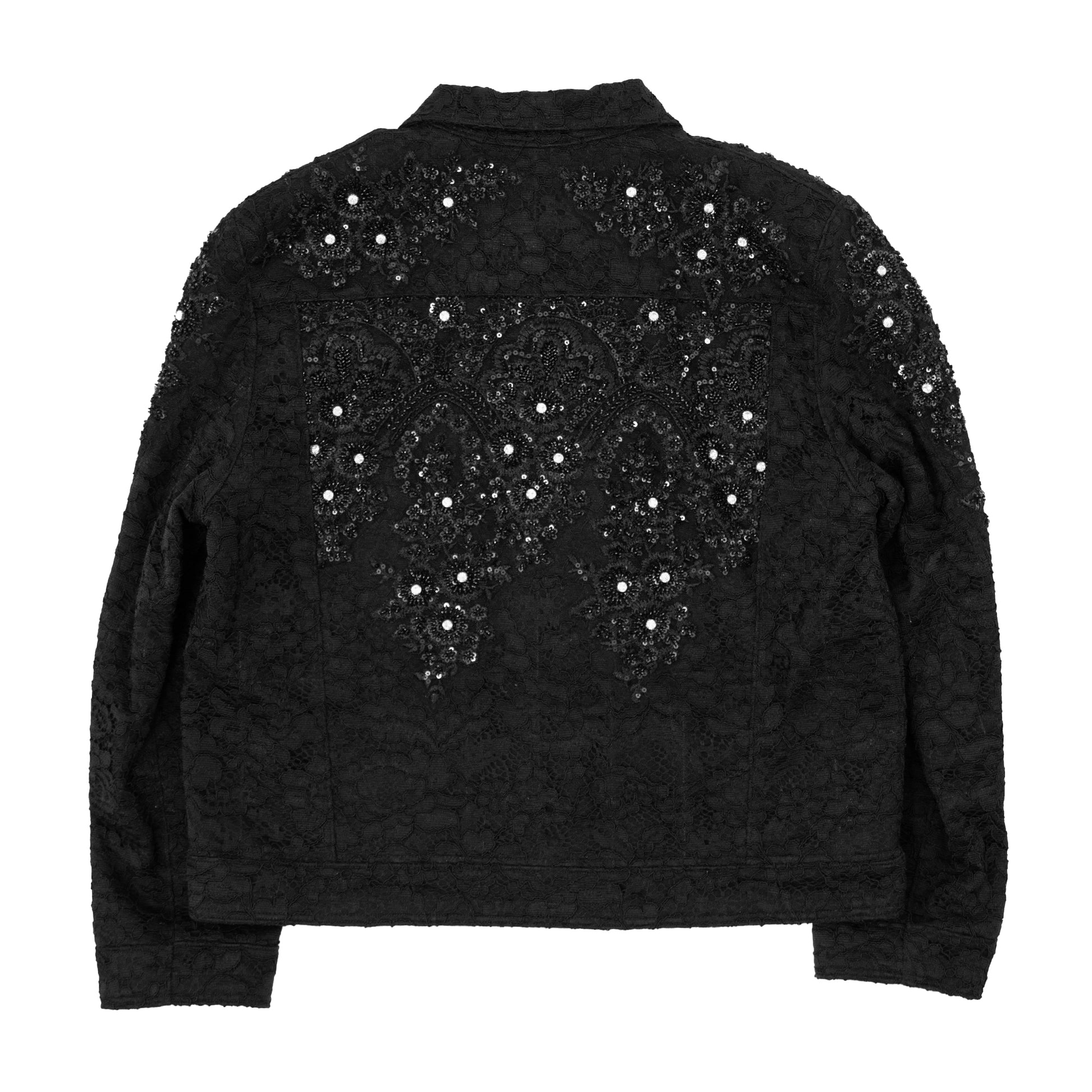 Black denim with embroidered lace and 3D crystal embellishment. Self lined.