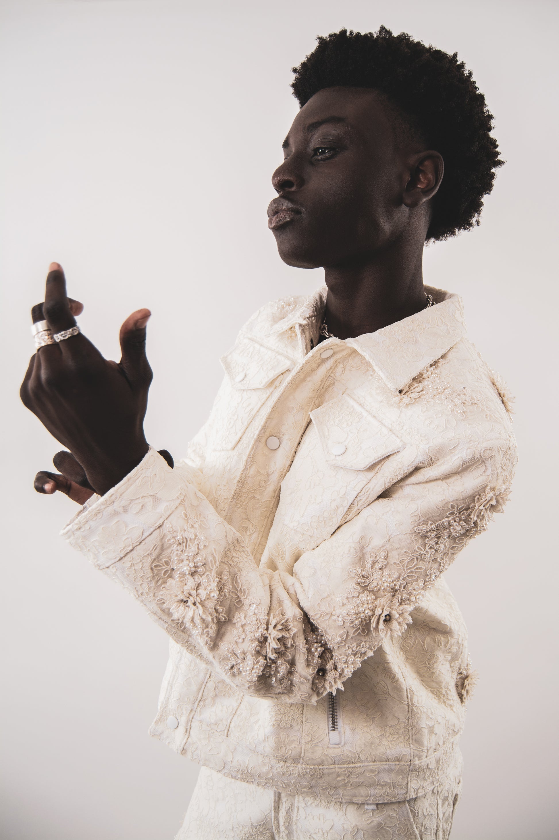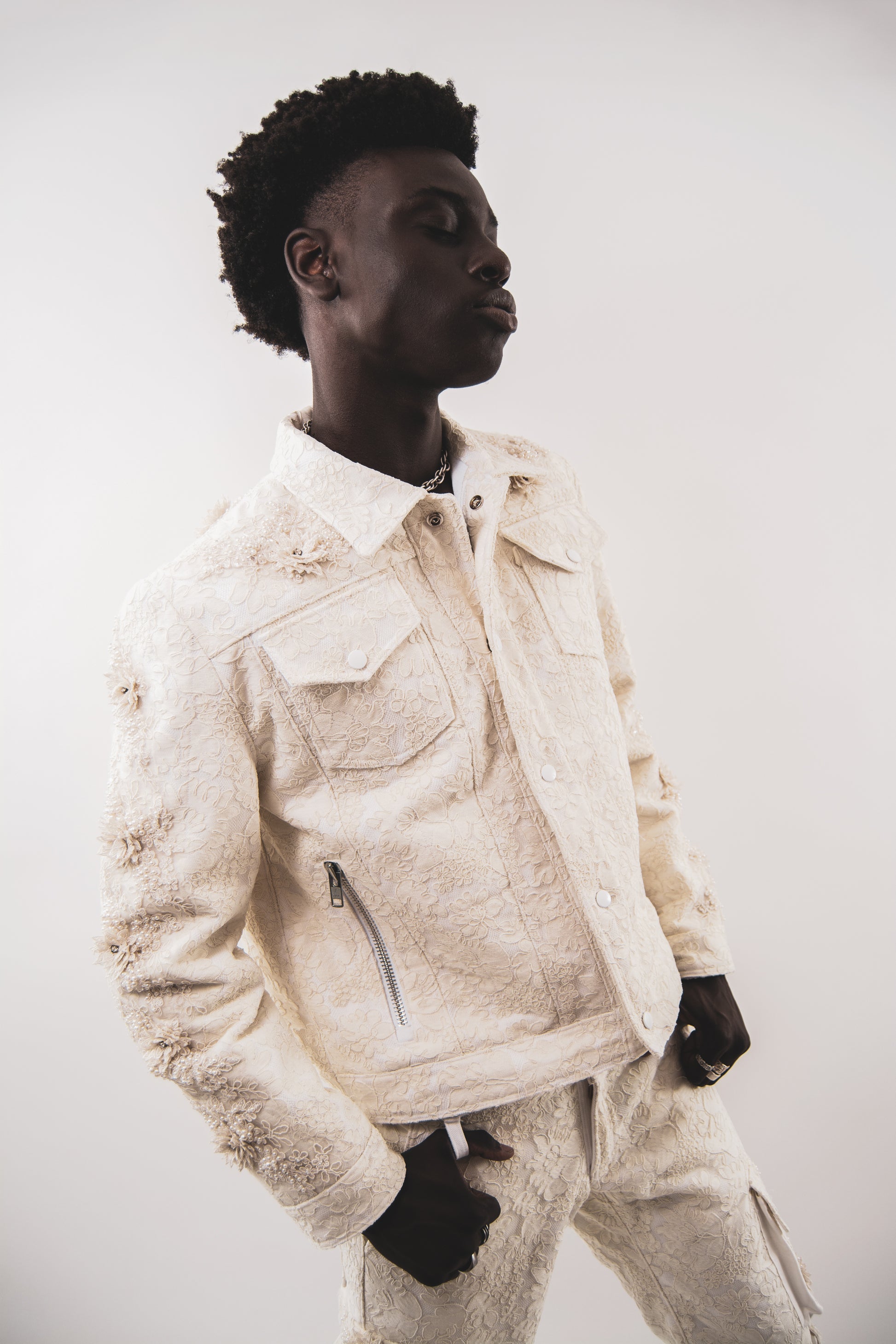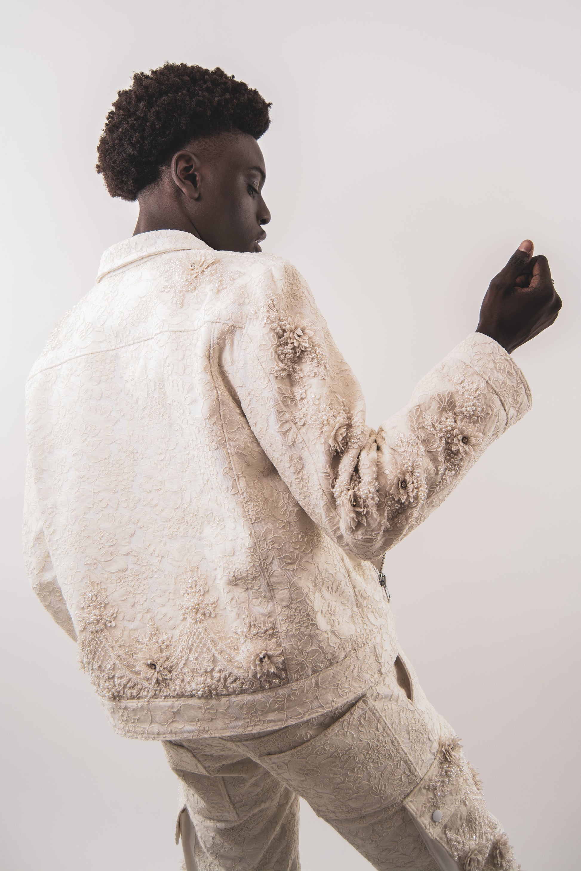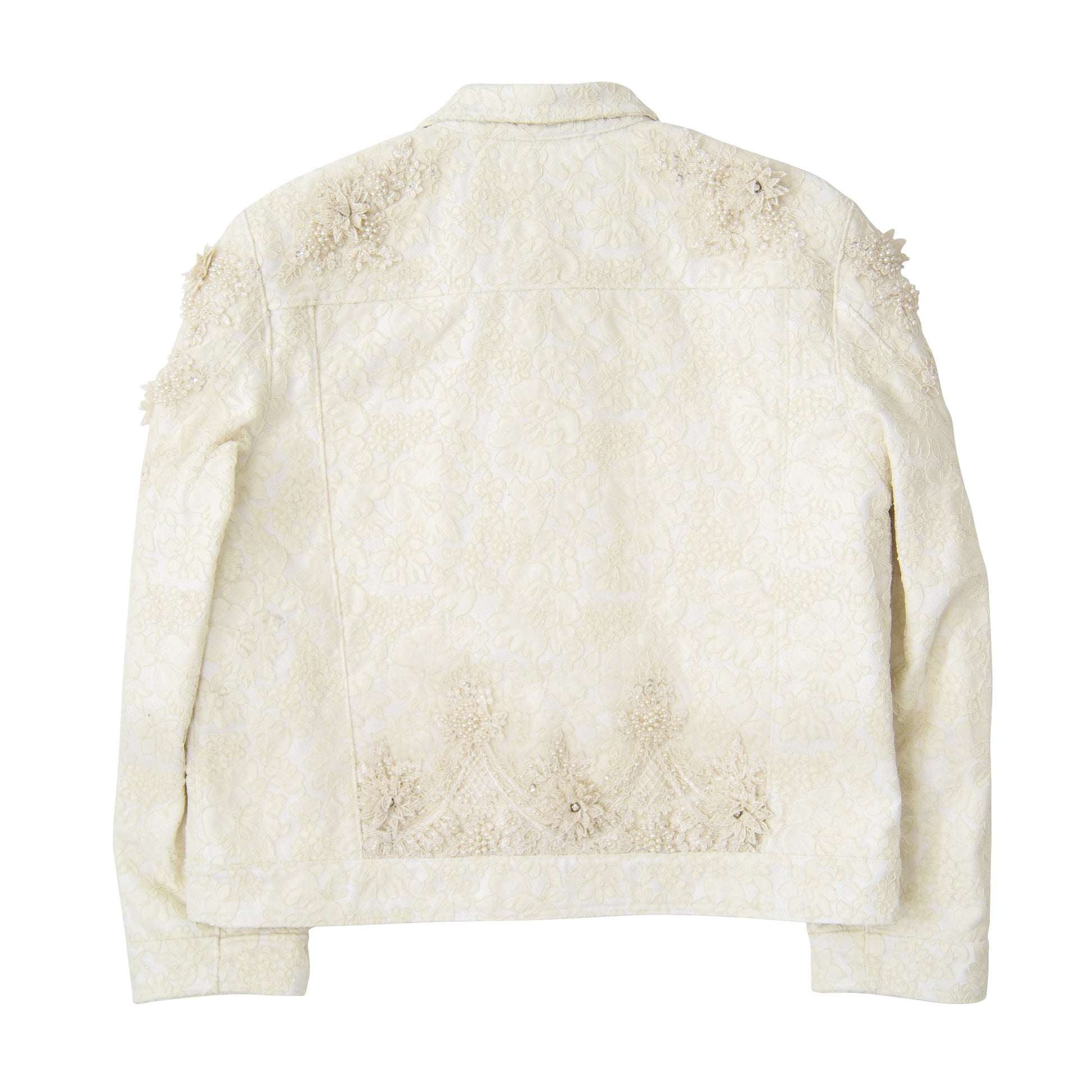 White denim with embroidered lace and 3D floral embellishment. Self lined.