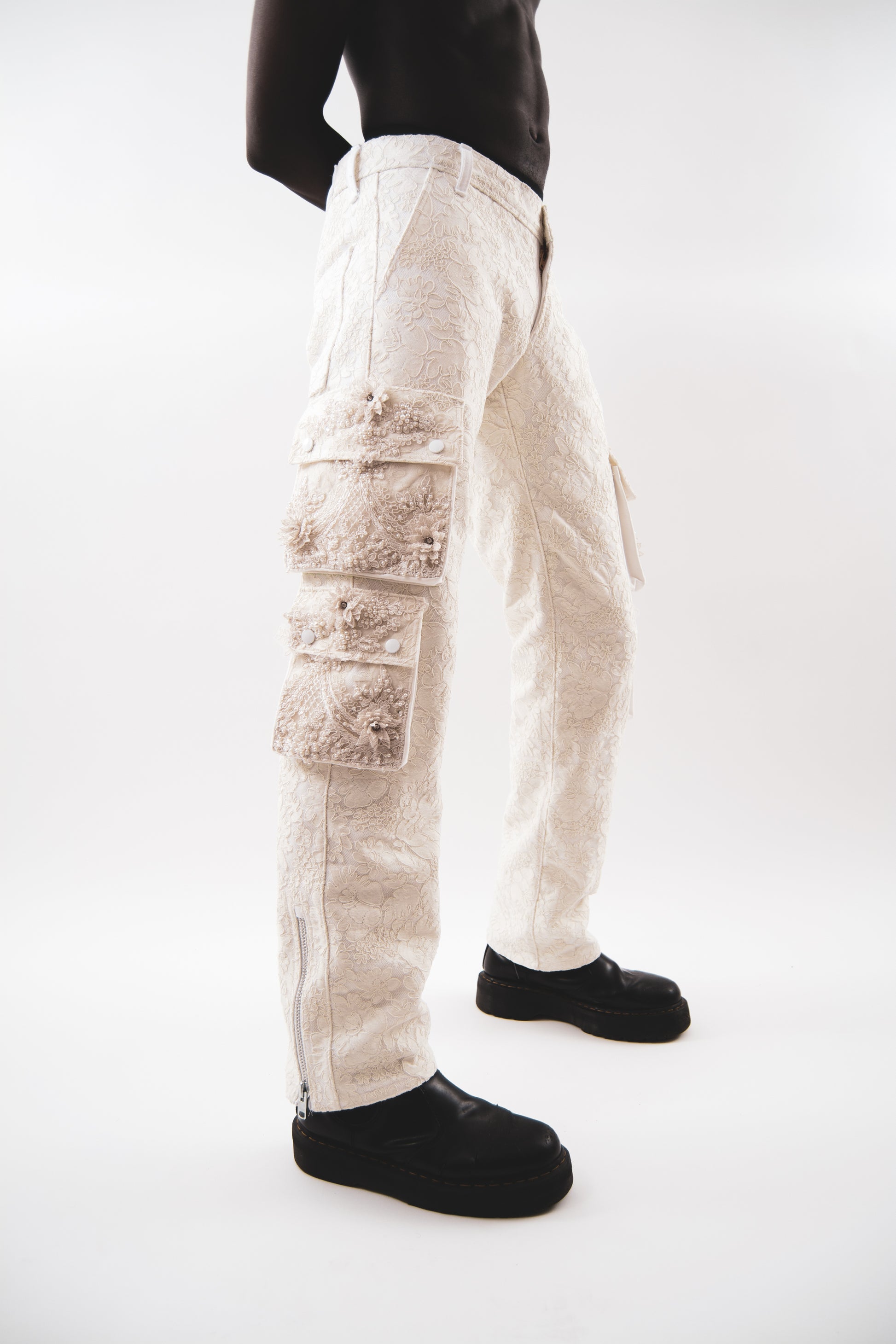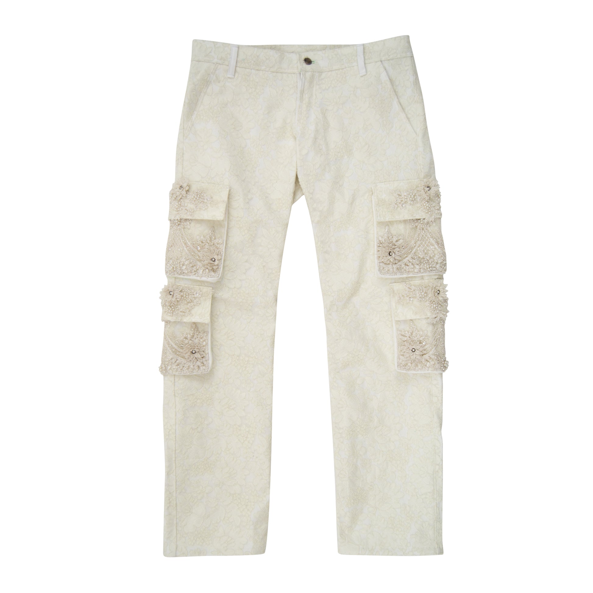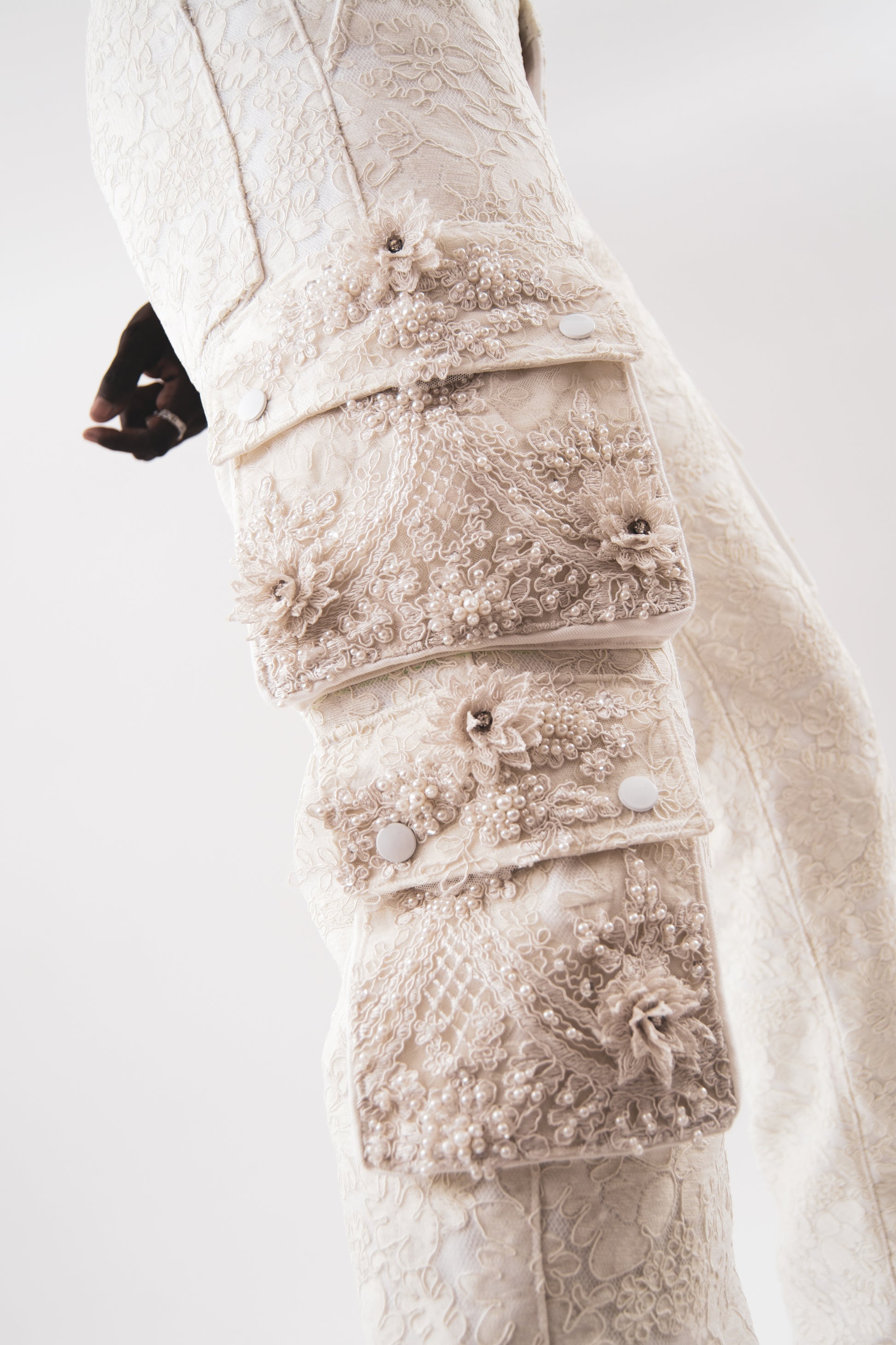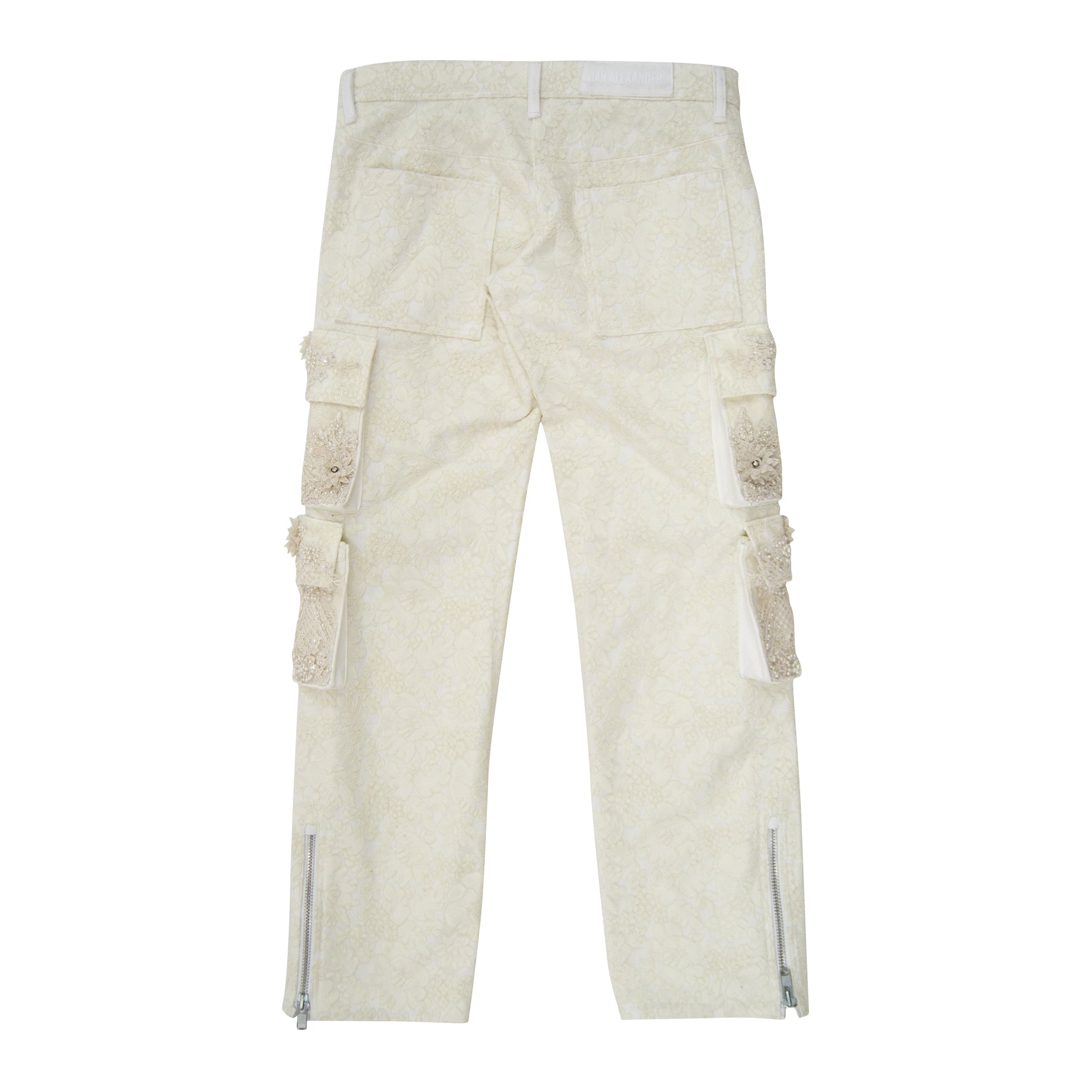 White denim with embroidered lace and 3D crystal embellishment. Self lined.