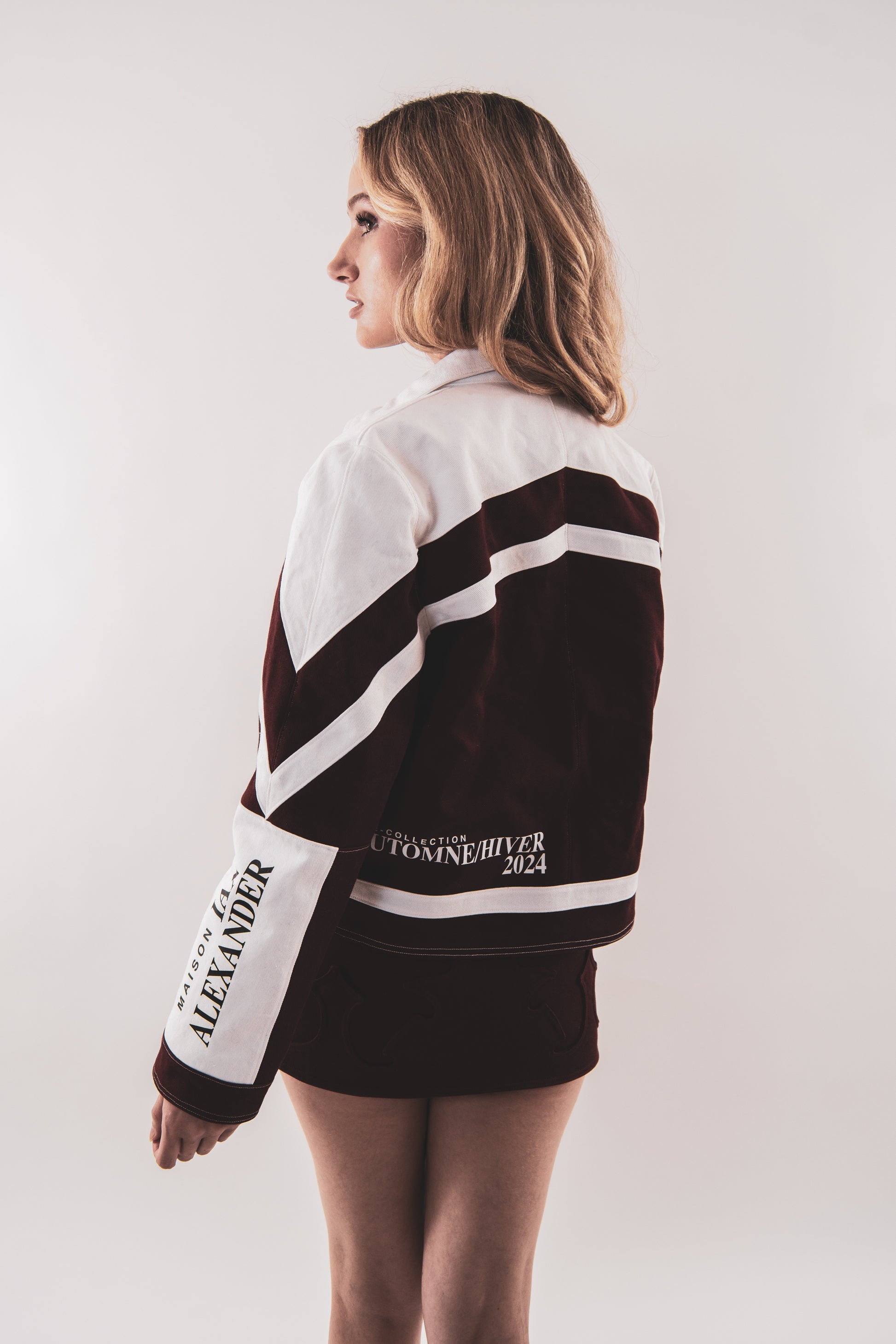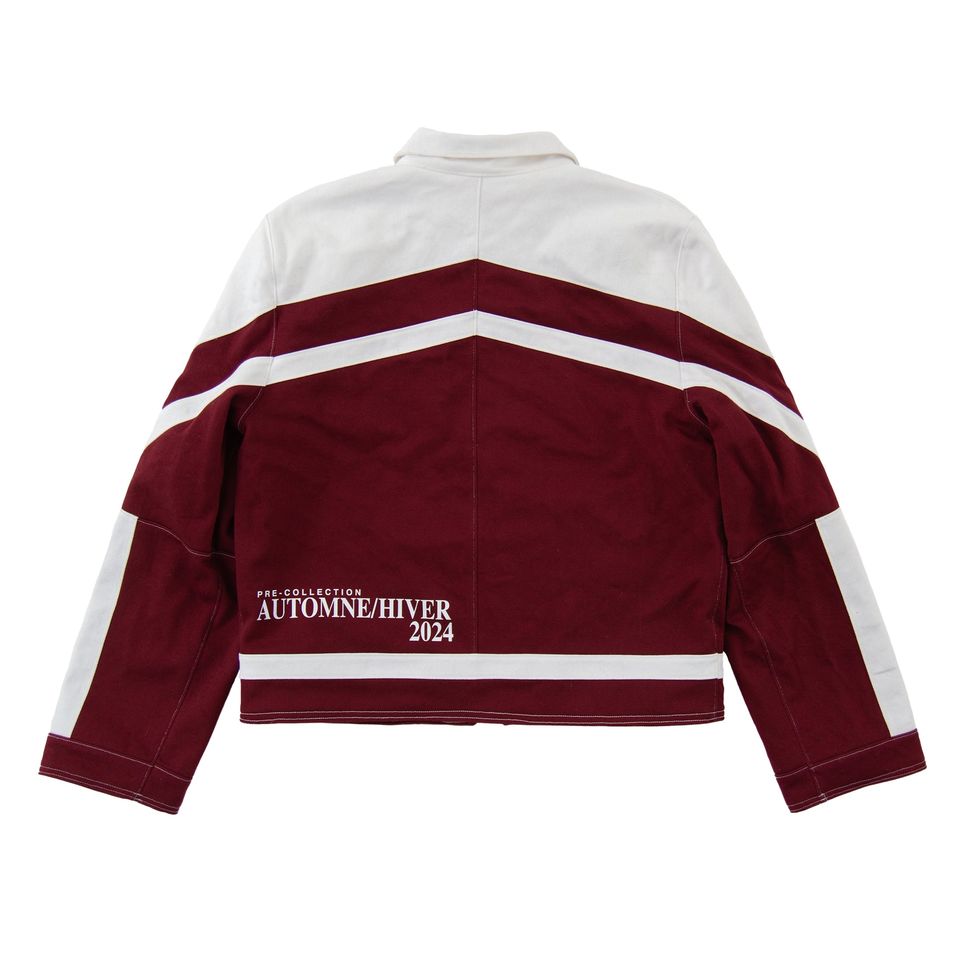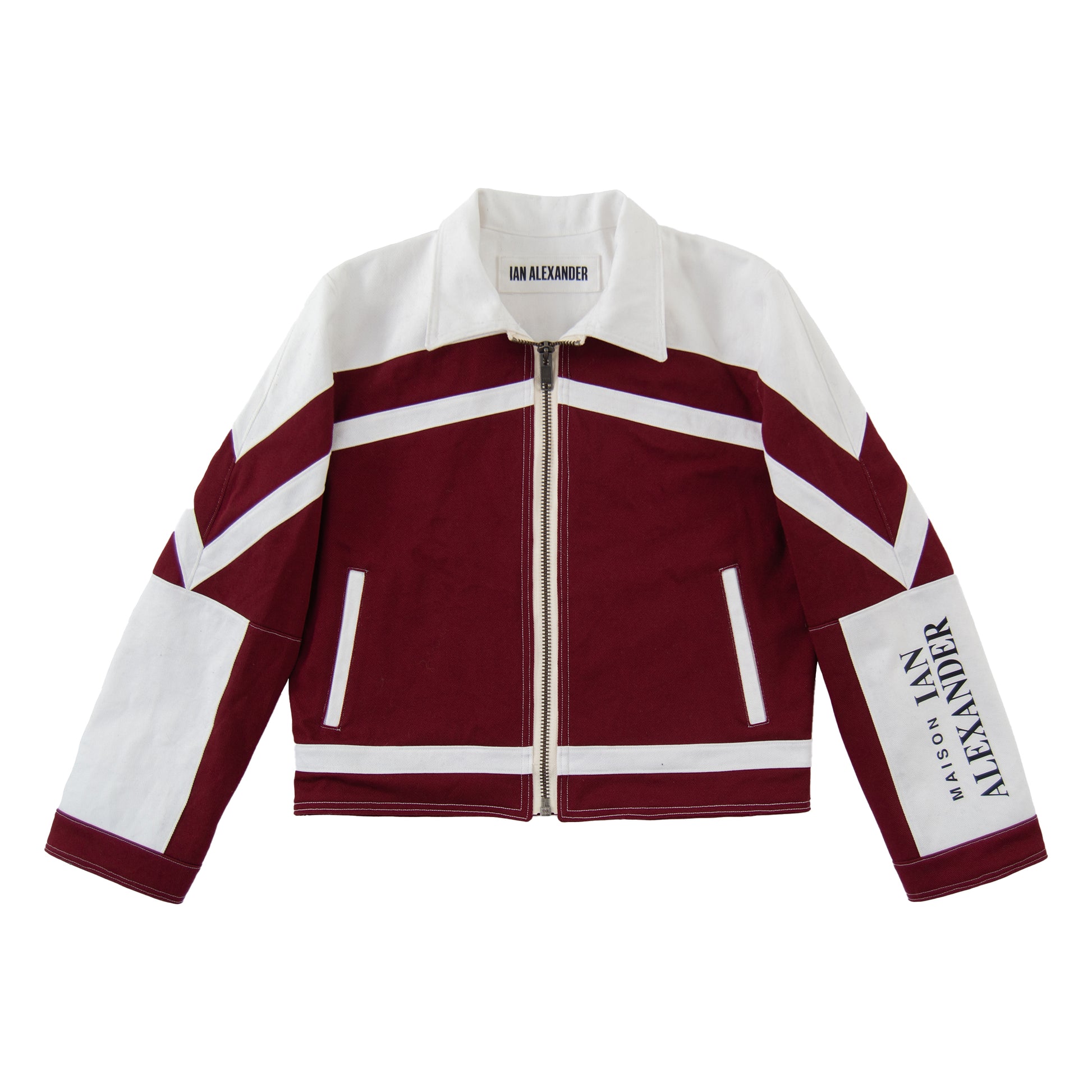 Moto denim jacket color blocked with contrasting denim and vinyl appliqué on sleeve and back. Self lined.
