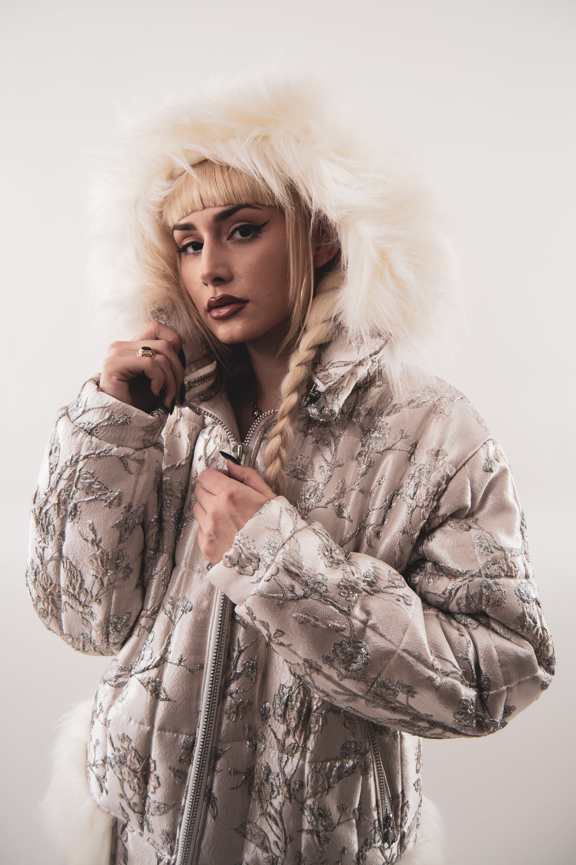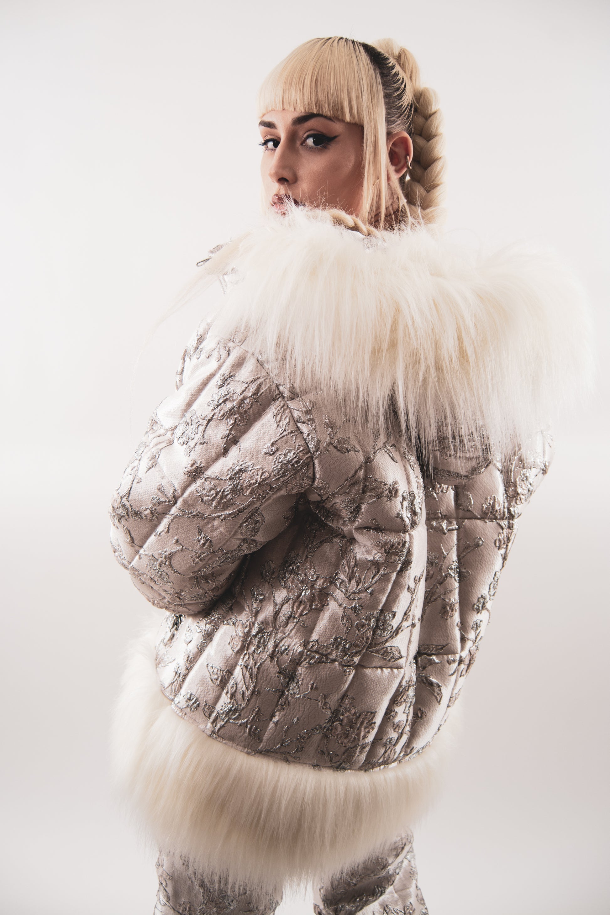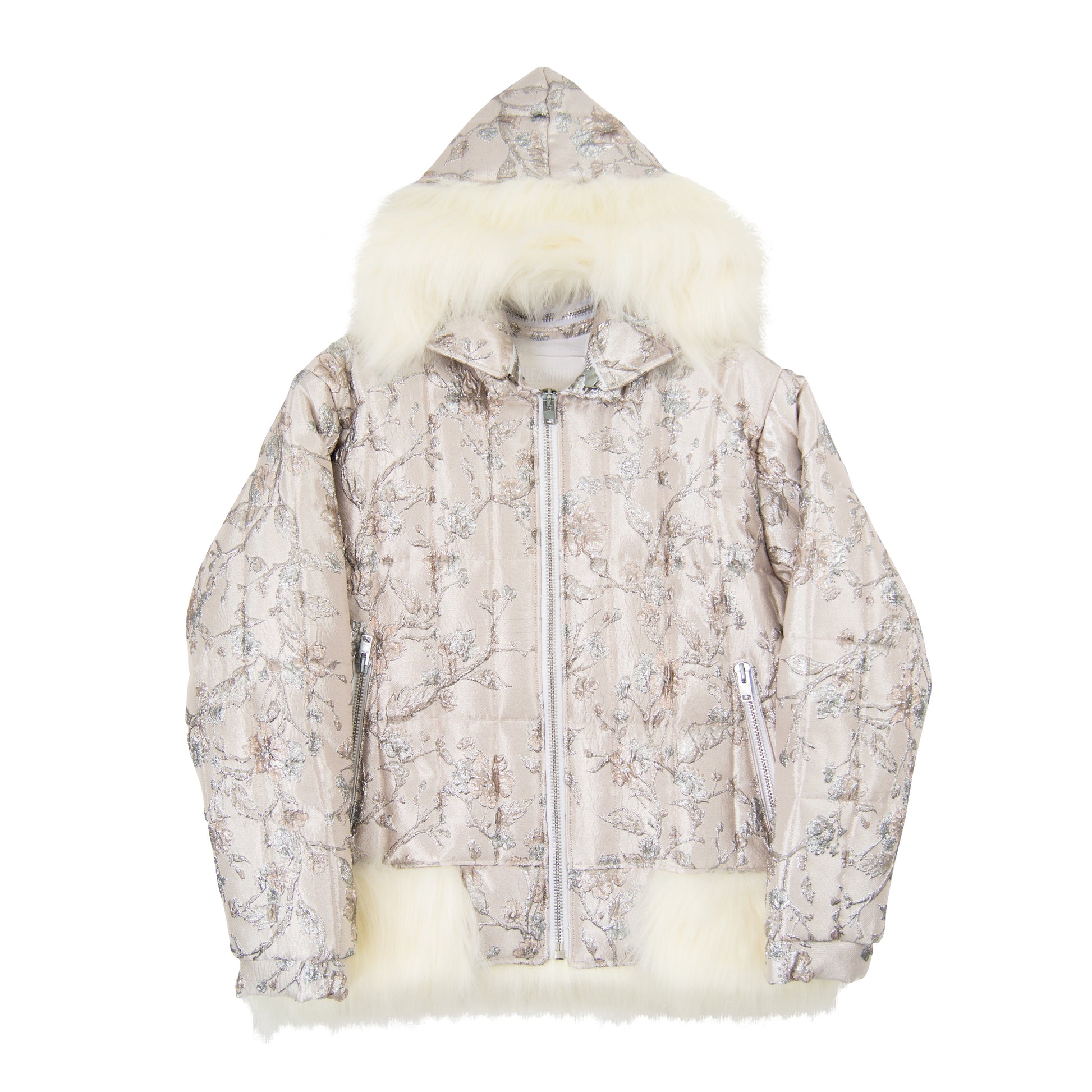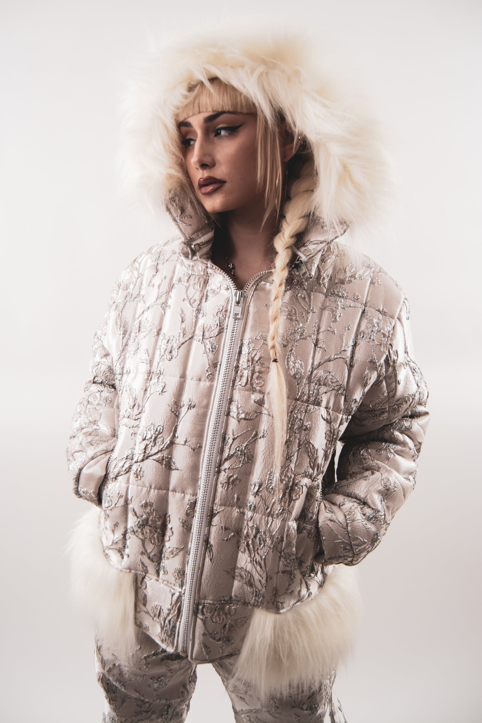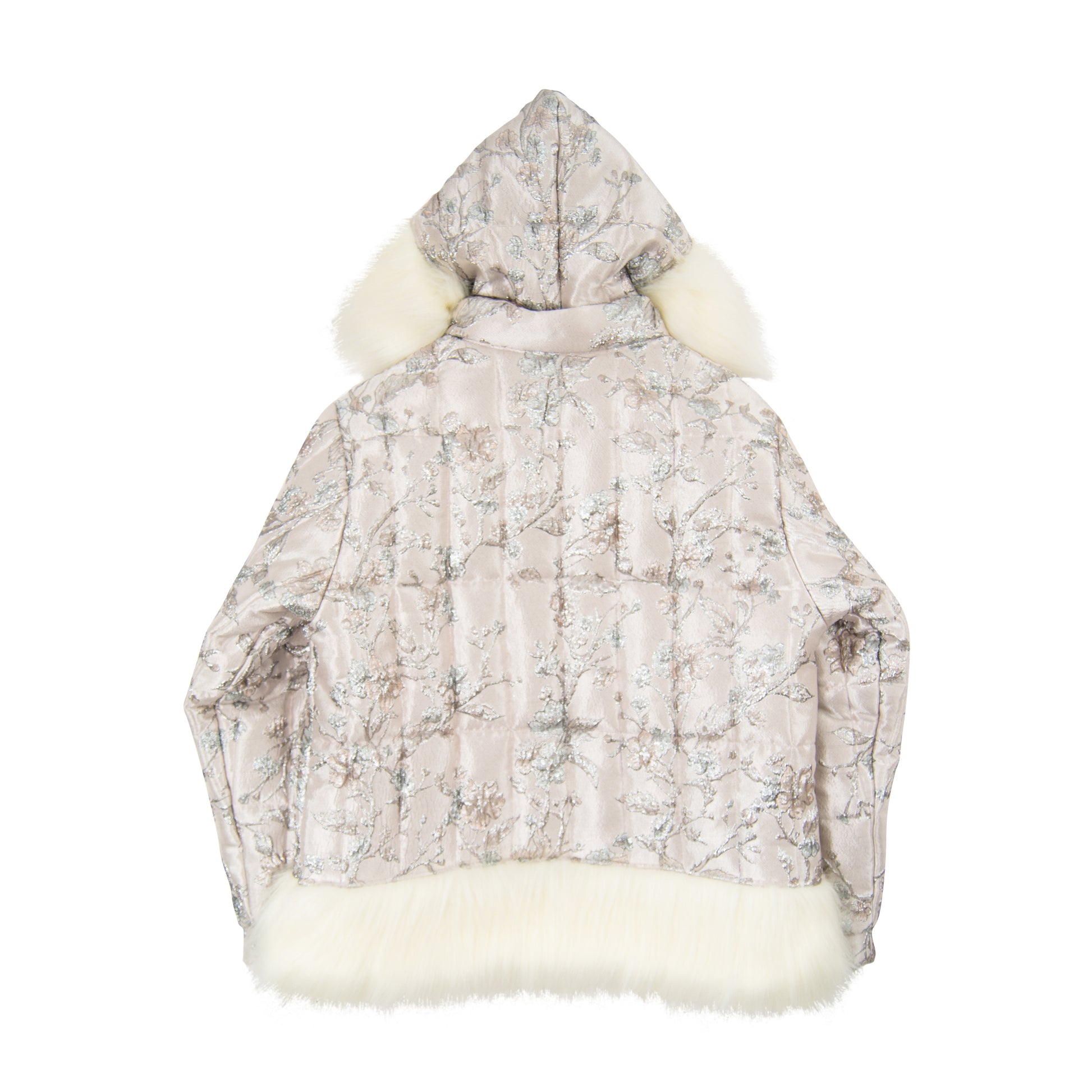 Metallic 3D brocade jacket with quilted batting for insulation. Features a removable hood and faux fur trim.